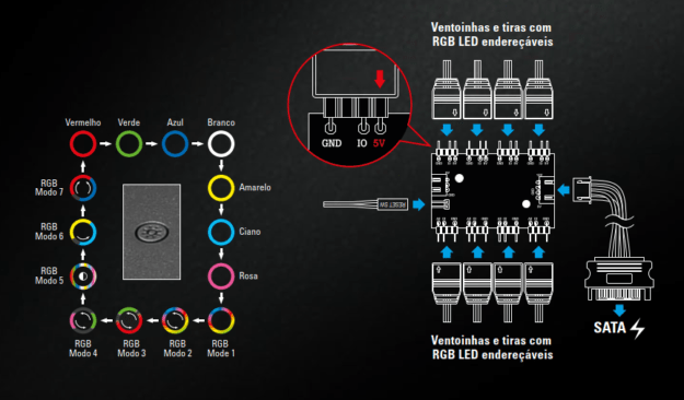 Os produtos Sharkoon marcados com o logótipo “ADDRESSABLE RGB” (ARGB) são compatíveis com placas-mãe que têm adaptador para ventoinhas e fitas de LED RGB endereçáveis. Os adaptadores devem ter a configuração de pinos 5V-D-coded-G e 5V-D-G. Alguns exemplos dessas conexões RGB dos fabricantes mais importantes de placa-mãe podem ser vista nas imagens abaixo. A configuração dos pinos RGB e a nomenclatura dessas conexões podem variar de acordo com os fabricantes. Para obter mais informações sobre compatibilidade, consulte o manual da sua placa-mãe ou visite o site do fabricante.