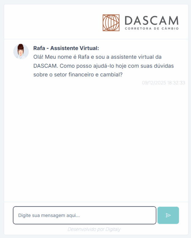 A Dascam Corretora de Câmbio lança a RAFA, uma assistente digital baseada em inteligência artificial generativa desenvolvida para responder dúvidas técnicas sobre câmbio, regulatório e capitais internacionais. A tecnologia reúne conteúdo do pós-Marco Cambial (2021), resoluções do Banco Central, do Conselho Monetário Nacional (CMN) e documentos oficiais que orientam o mercado.