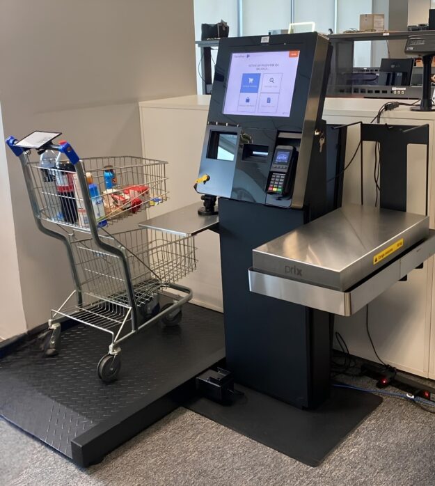 Após confirmar a finalização das escolhas no sistema, um QR Code é gerado para ser lido no terminal de self-checkout, onde todos os itens aparecerão automaticamente registrados. Para garantir segurança e precisão, o self-checkout solicita que o carrinho seja pesado em uma balança posicionada no chão, ao lado do terminal. O peso total é confirmado de acordo com os produtos que foram escaneados ao longo da compra. Após essa confirmação, o cliente pode efetuar o pagamento e concluir sua jornada com muito mais facilidade, enquanto o varejista tem a certeza de que todos os itens foram devidamente pagos.