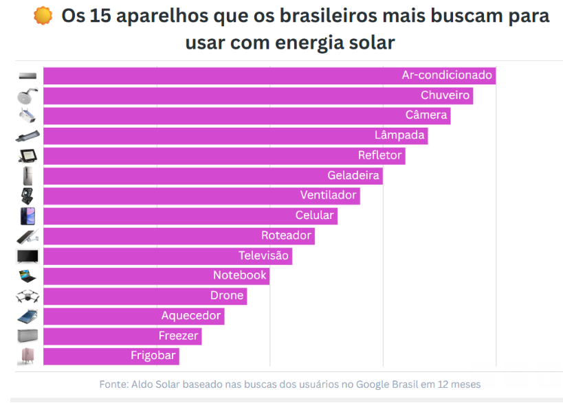 De acordo com levantamento da Aldo Solar, maior distribuidora de energia solar do Brasil, foram registradas cerca de 600 mil pesquisas no Google nos últimos 12 meses sobre produtos movidos a energia solar — um reflexo do crescente interesse por soluções limpas, portáteis e acessíveis. A busca revela ainda os 15 aparelhos mais desejados pelos consumidores, entre eles ar-condicionado, geladeira, chuveiro, ventilador, roteador e notebook, além de equipamentos portáteis, como celulares, drones e câmeras, que representam a expansão da autonomia energética para além das residências.